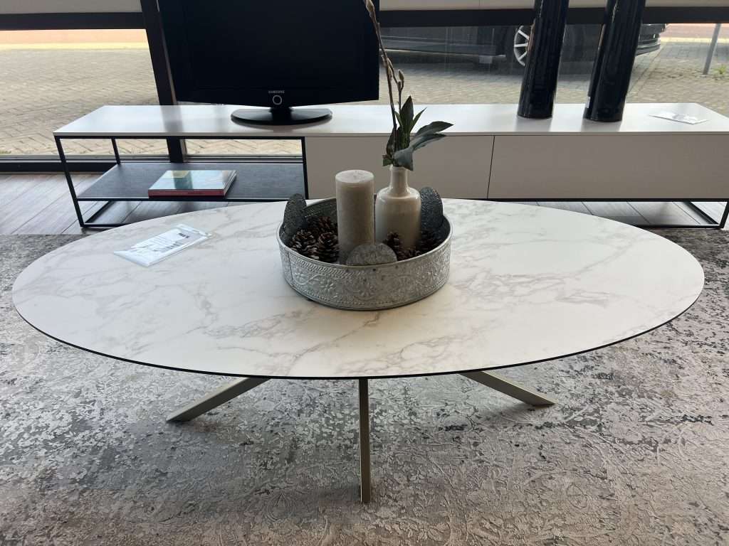 Salontafel ovaal 130/70 cm facetrand HPL carrara creamy met onderstel champagne (008-472)